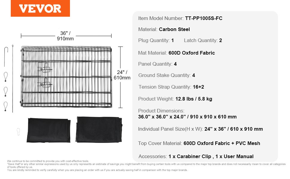 1.Versatile Use: This dog playpen is composed of 4 panels that form a spacious 36" x 36" square. The door opens all the way to the top, and the top cover can be opened with a zipper, allowing for easy access for the owner.