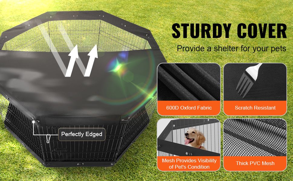 3.600D Heavy-Duty Oxford Fabric: Both the top cover and the base of our exercise pen are made of waterproof, scratch-resistant, easy-to-clean, sun-resistant 600D Oxford fabric. The ground mat protects floors, while the top cover prevents pets from jumping out. Half of the top cover features a reinforced mesh design to allow airflow, light penetration, and reduce the sense of confinement.