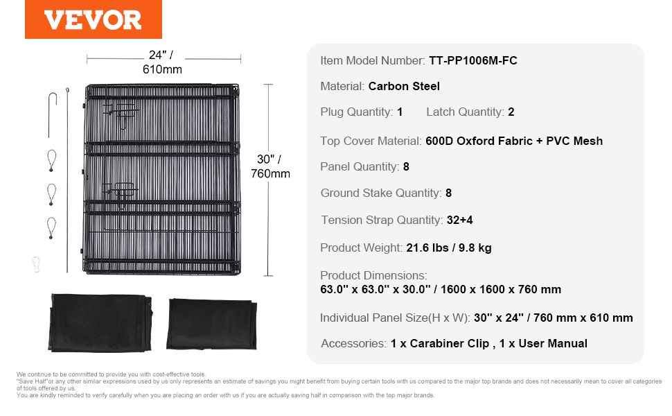 1.Versatile Use: This dog playpen is composed of 8 panels that can be arranged into a 24" side-length octagon, providing a spacious area for pets. The door opens all the way to the top, while the top cover can be zipped open for easy access by the owner.